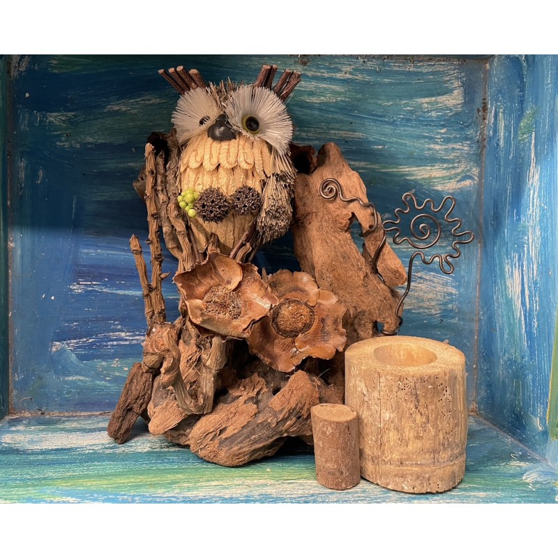 利用稻草、樹枝、木頭和椰子蒂頭,及自然素材製作而成,貓頭鷹代表吉祥,也象徵知識與智慧,這麼特別的造型,獨一無二、僅此一個,還不趕快下單搶購!