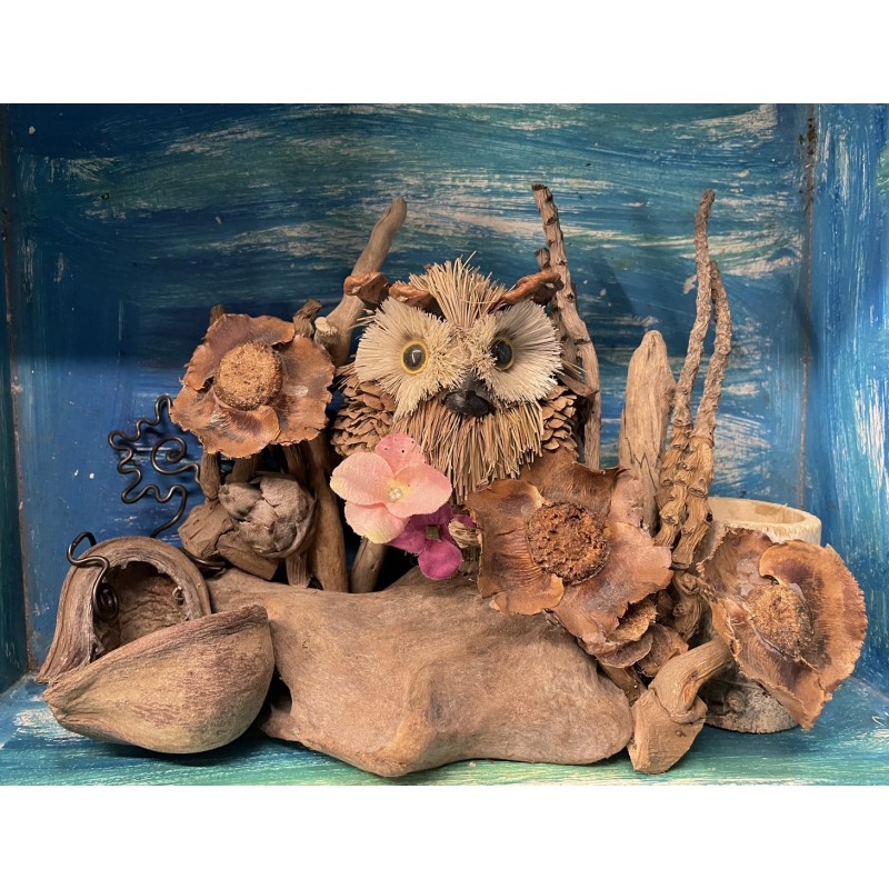 利用稻草、樹枝、木頭和椰子蒂頭,及自然素材搭配核桃製作而成,貓頭鷹代表吉祥,也象徵知識與智慧,這麼特別的造型,獨一無二、僅此一個,還不趕快下單搶購!