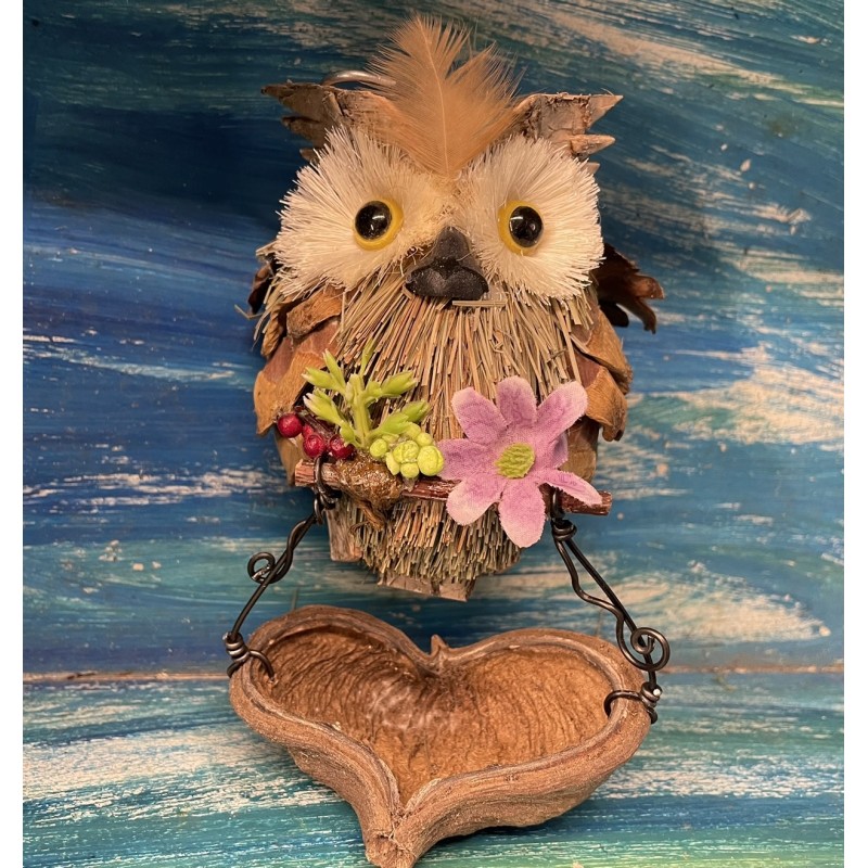 利用稻草、羽毛及自然素材,做成可以掛在牆上的貓頭鷹裝飾,下面的小盤子,也可以放些小東西,實用又好看,趕快下單訂購吧!